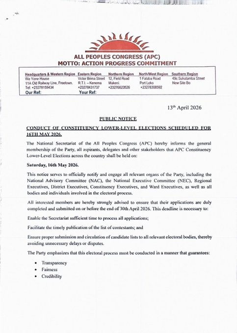 In a public notice dated April 13, 2026, and signed by the party’s National Secretary-General, Lansana Dumbuya Esq., the APC National Secretariat informed all members, aspirants, delegates, and stakeholders that preparations are now in full motion for the nationwide exercise. The announcement immediately activates key organs of the party, including the National Advisory Committee, the National Executive Committee, regional, district, constituency, and ward executives, signaling a coordinated effort to ensure a smooth and credible process.